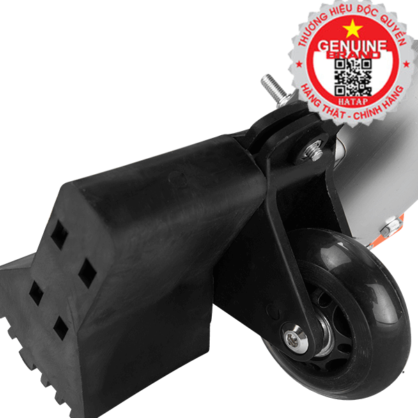 Đó là các gia cố bên ngoài của chiếc thang. Cụ thể chúng ta dễ giàng nhìn thấy các thanh giàng và nẹp gia cố ở đĩnh thang cũng như giữa các vế thang nhôm với nhau. Chân thang gồm 2 thanh ngang có 8 miếng chân đế cao su giúp giữ thăng bằng cũng như giúp tải trọng thang tốt hơn. Tiếp đến là 2 bánh xe hỗ trợ người dùng có thể kéo chiếc thang đi lại một cách dễ giàng nhất.