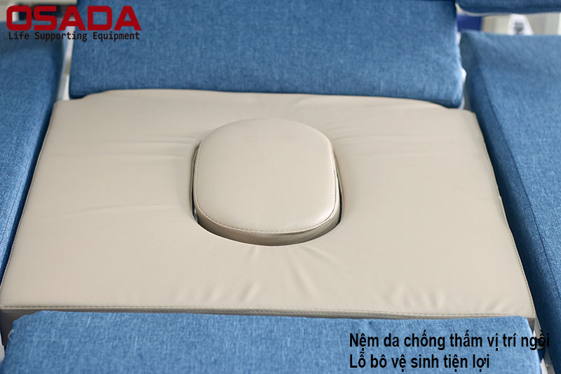 4- Chức năng bô vệ sinh tại giường: Chức năng bô vệ sinh được trang bị giúp người bệnh dễ dàng đi vệ sinh ngay tại giường mà không cần phải di chuyển qua nhà vệ sinh vất vả như trước đây. Phần bô vệ sinh được thiết kế ngay chính giữa chổ ngồi của xe lăn khi tách ra, rất dễ dàng lau chùi vệ sinh nhờ vào phần lót ngồi được trang bị bằng tấm lót ximily không thấm nước. Khi cần đi vệ sinh chỉ cần gạt cần cho miếng nệm ở lỗ bô tụt xuống là có thể đi vệ sinh nhanh chóng.