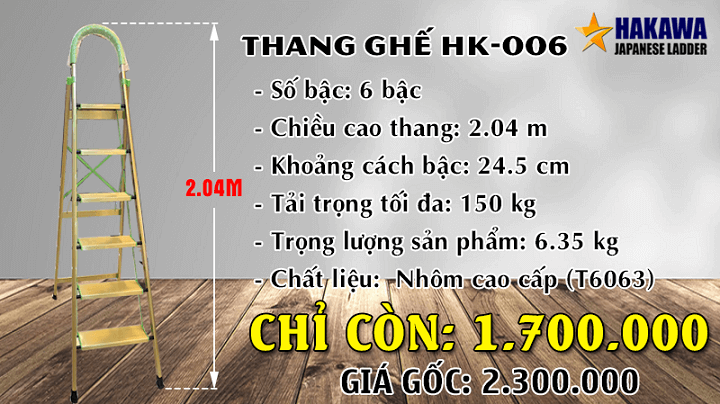 Thang nhôm ghế HK-006 có thiết kế nổi bật với màu vàng đồng sang trọng, chịu tải lên tới 150kg giúp hỗ trợ các công việc trên cao an toàn và nhanh chóng, phù hợp với tất cả mọi đối tượng sử dụng.